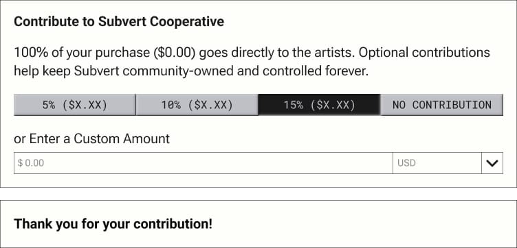 When supporters purchase music on Subvert, they'll see optional contribution amounts at checkout: 5%, 10%, 15%, 20%, custom amount, or no contribution. The message is clear: "100% of your purchase goes directly to the artists. Optional contributions help keep Subvert community-owned and controlled forever."