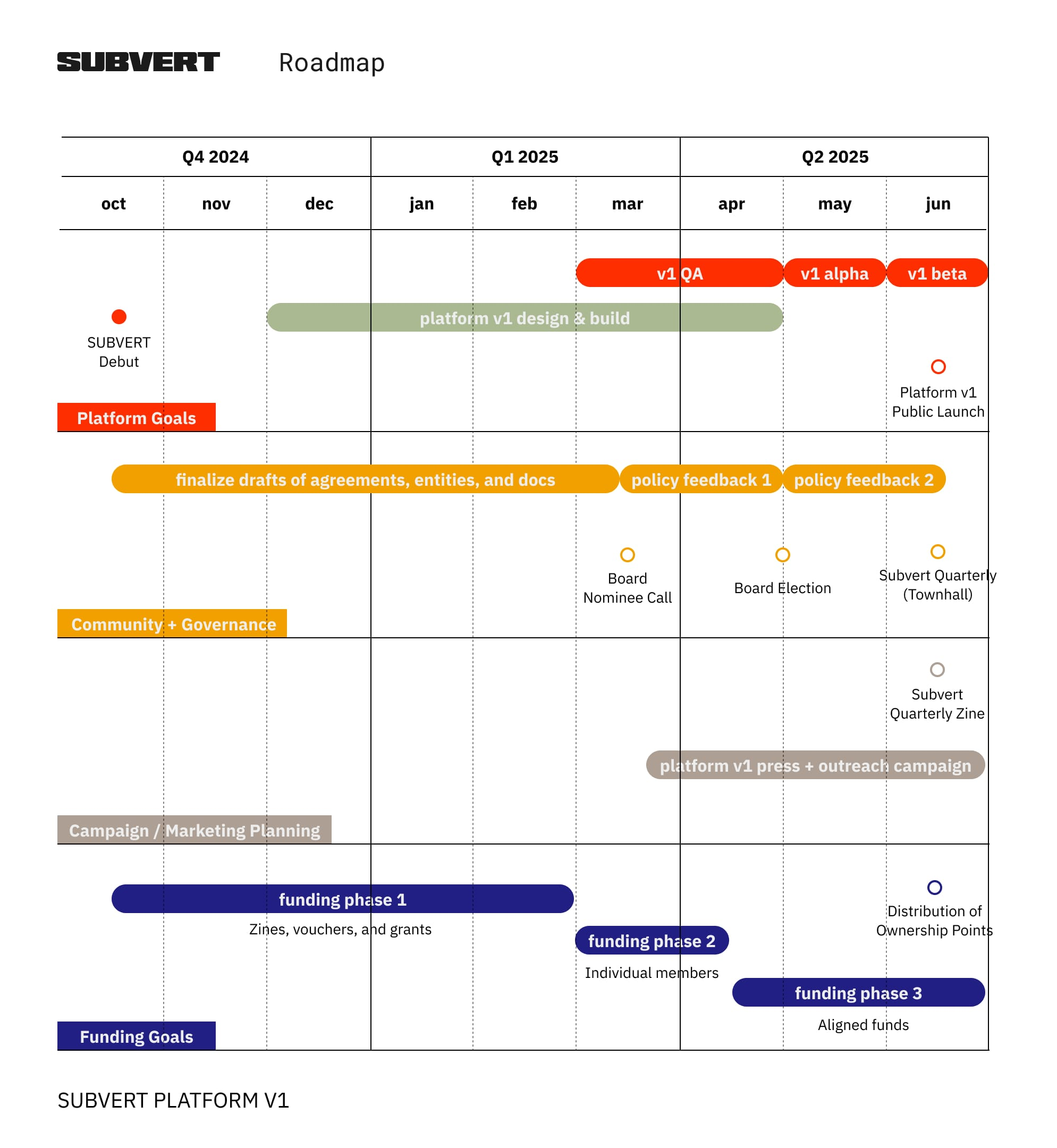 - Beginning of June: Full platform launch with an elected board of directors, complete legal and organizational model, and our first Subvert Quarterly event