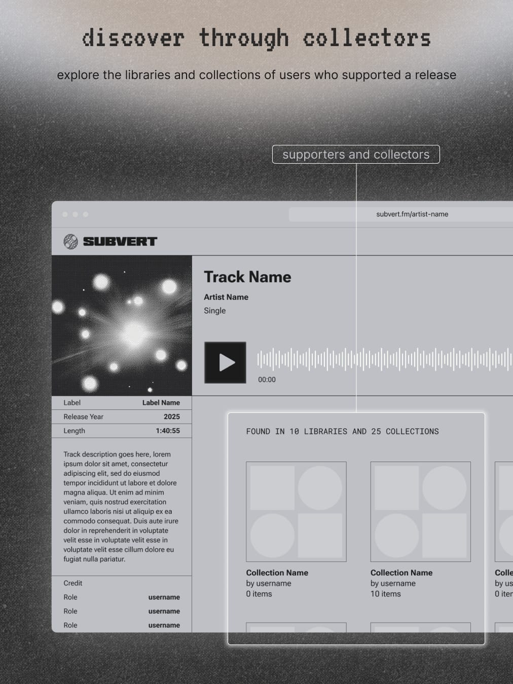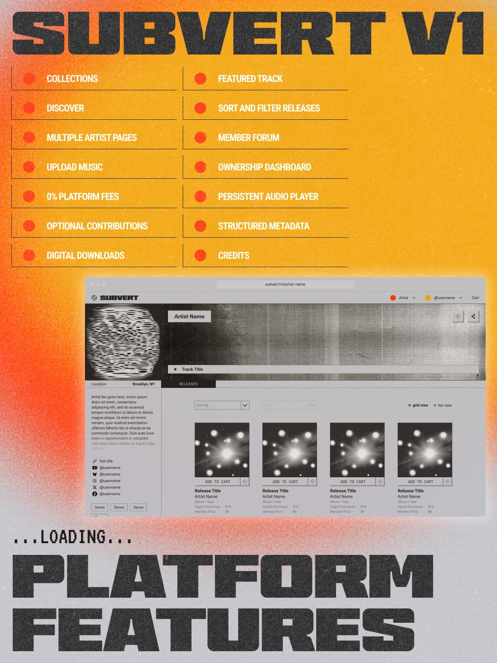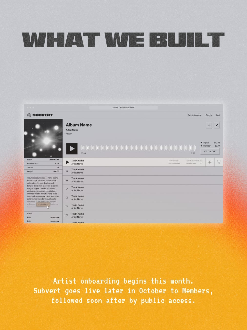 Before we get there, we want to give an early look at what’s being built. From artist upload flows to streaming and in-platform previews, we’re sharing glimpses of the Subvert platform as it comes to life.