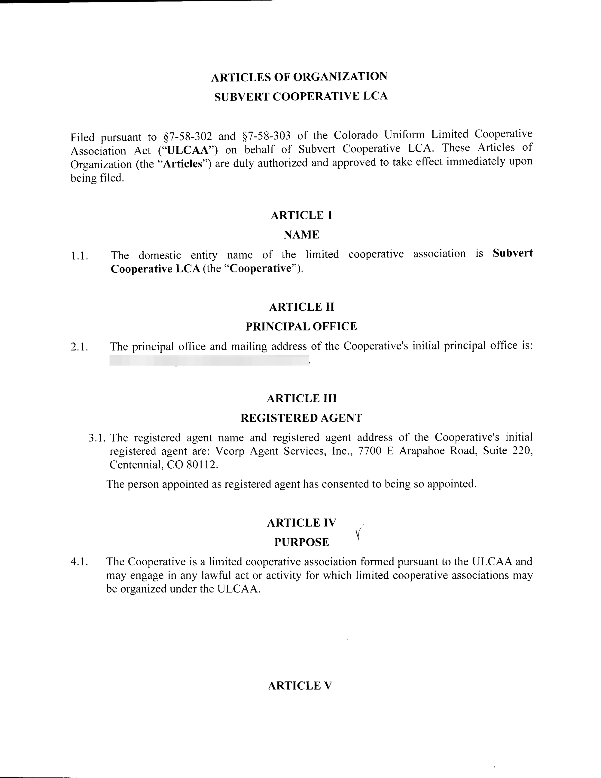 Subvert Cooperative LCA officially registered as a legal entity in Colorado, marking the formal beginning of Subvert as a cooperative.