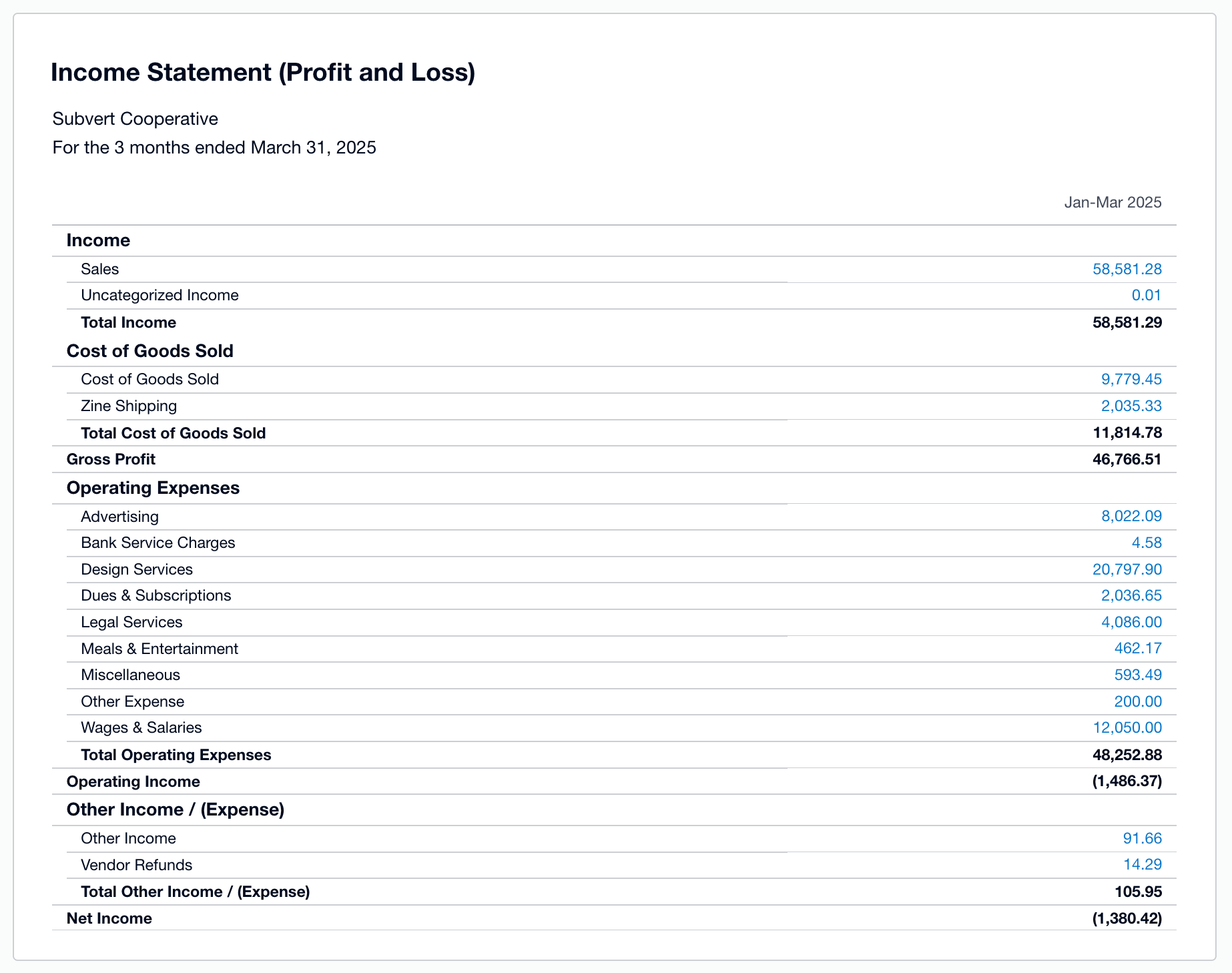 Transparency Q1 2025 Q1 of 2025 was our first second quarter since launching our zine and co-op membership. This is our profit and loss statement from the beginning of January 2025 to the end of March 2025. Previous Next